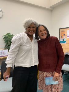 Alt Text – The picture shows Tammye Huf, the author of A More Perfect Union, and Janice Taylor smiling to the camera at Tammye’s recent talk on her book. Janice is holding a copy of Tammye’s book in her hand.